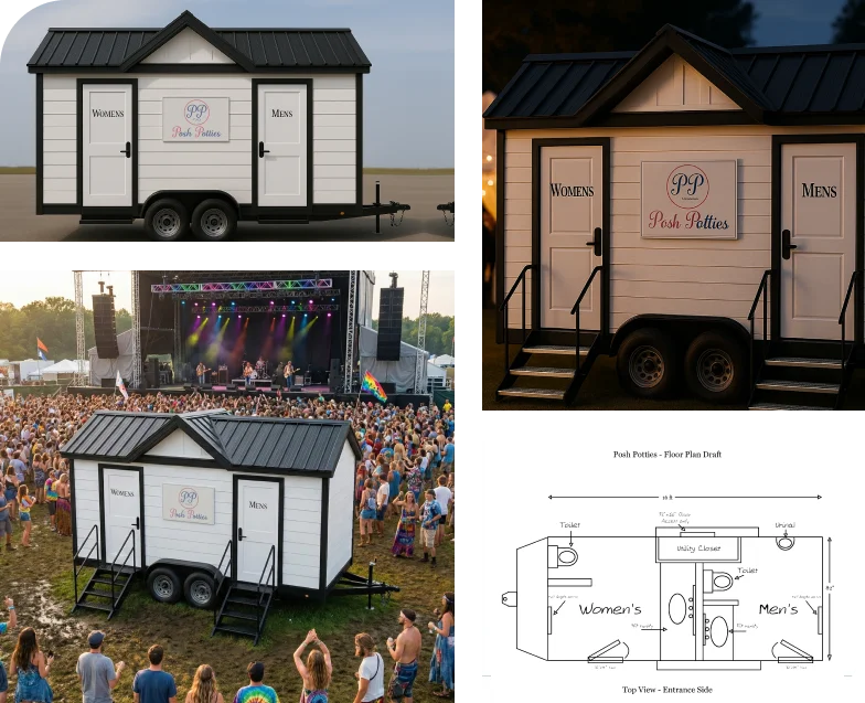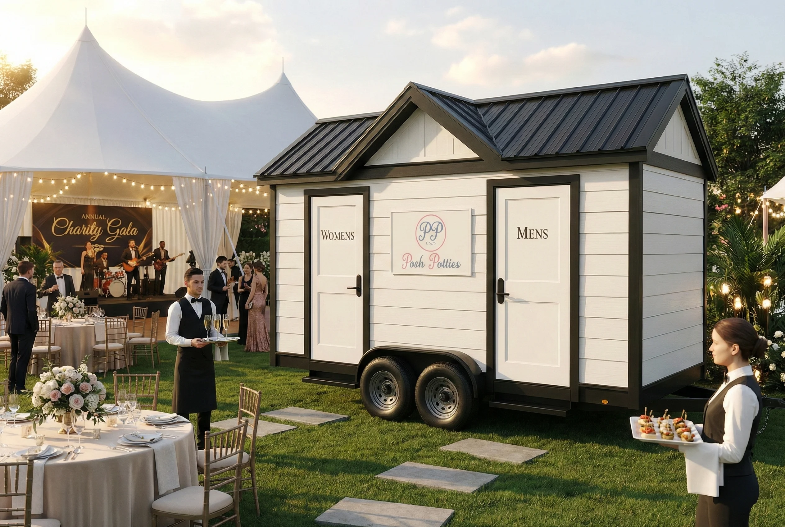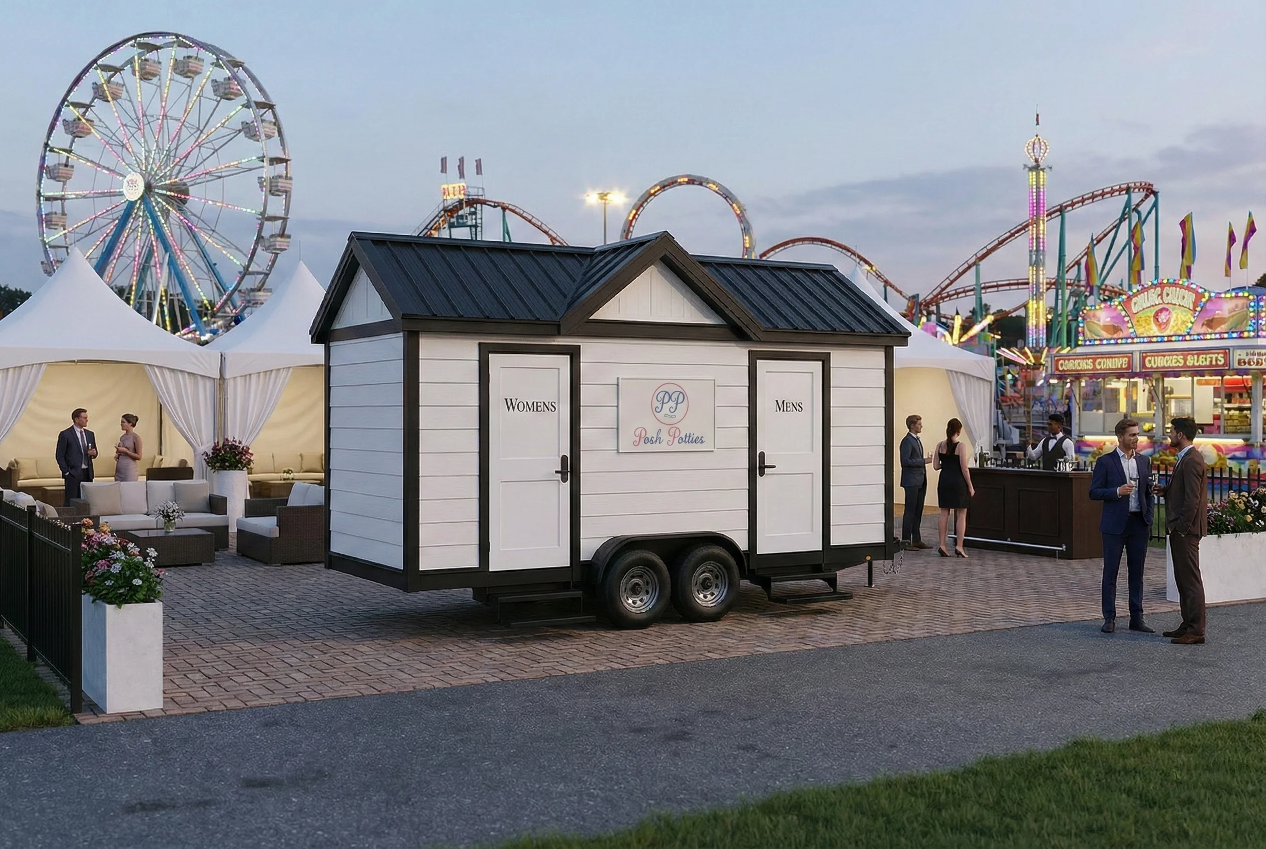 Posh Potties was started to put a different twist on luxury bathroom trailer rentals. Our trailer looks like a little house! There is no need to hide our trailer behind a row of trees or behind a building